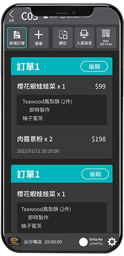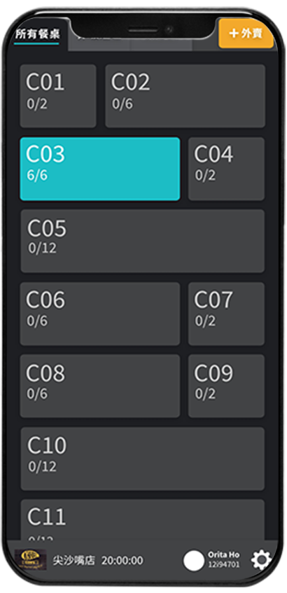 為餐廳設定餐桌數量和人數上限,在入座時可以輸入客人數量,並即時查看位置情況,為客人分配座位、安排搭枱,方便管理。安排入座後列印點餐QR Code,並查看訂單及顧客資料,方便出餐和管理外送服務。