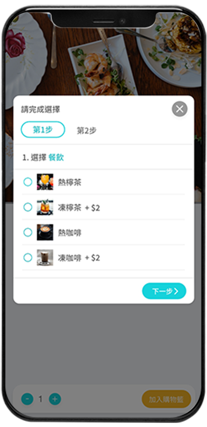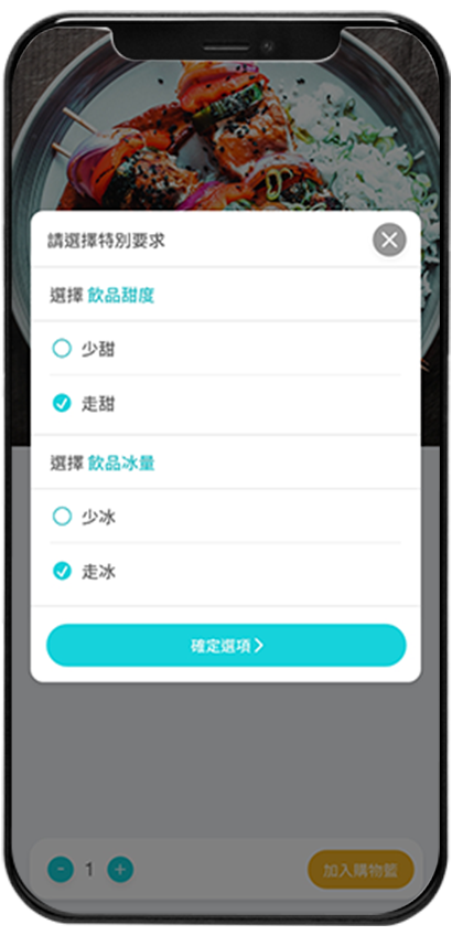 顯示不同的食品類別、名稱及選項, 可選擇單點或是套餐, 及記錄特別要求如飲品要少冰。
