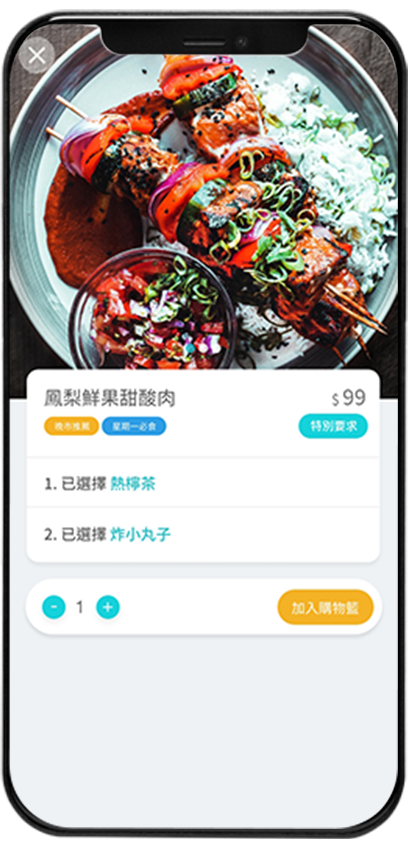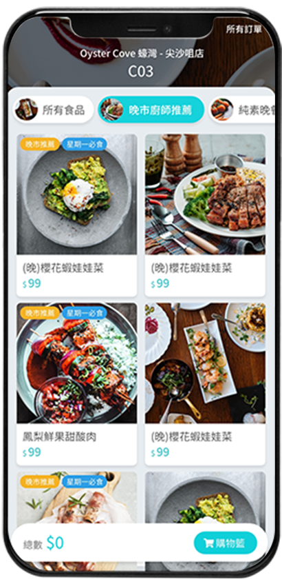 顯示不同的食品類別、名稱及選項, 甚至選擇不同套餐, 如對食物有特別要求都可以在點餐時提出。 前台員工方面, 可以查看點餐記錄,或者應客人個別要求為他們修改菜式。 當結帳時可以直接選取指定座位快速結帳。
