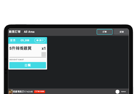廚房接收訂單並安排出餐,查看庫存資料並快速關閉已售完的菜單,避免因不能提供餐點而影響客人。